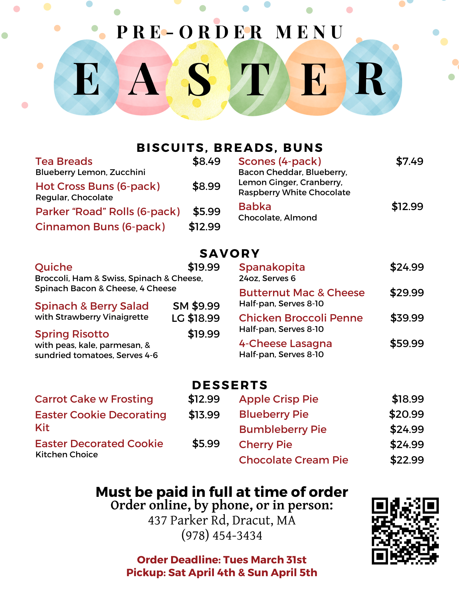 Easter Pre-order Menu