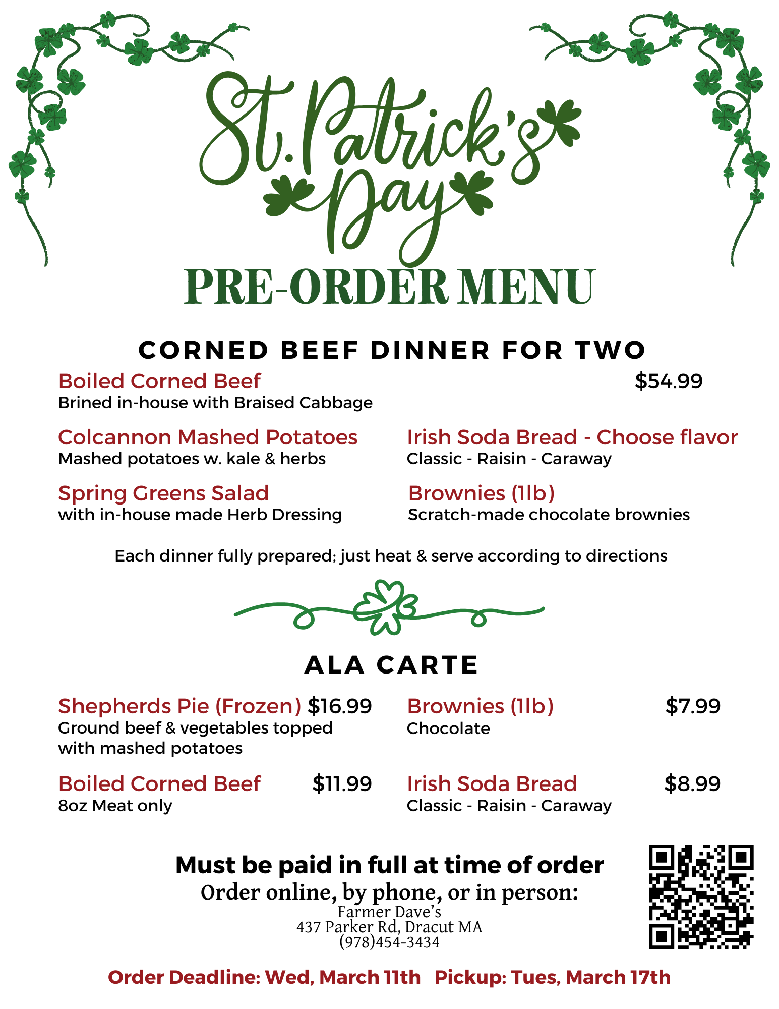 Place your order ahead of time, pick up with ease, and enjoy a hearty holiday meal without the hassle. Sláinte!